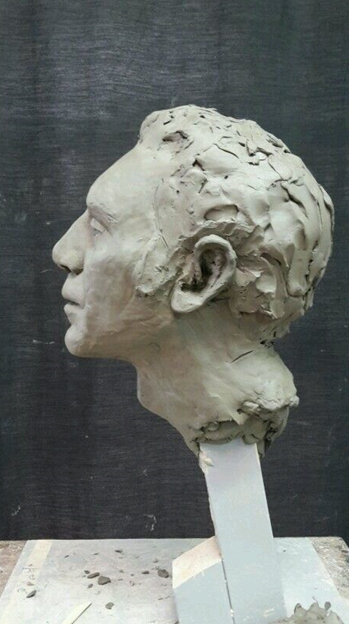 Klei is een vormeloos materiaal, het is zacht en ondefinieerbaar. Het beeld dat lik wil maken moet nog ontstaan. Vaak werk ik met klei realistisch en doelgericht. Als ik een portret naar model maak, ga ik een proces aan van niets (een hompje klei) naar een kop die aanspreekt en het eigene van de geportretteerde toont.