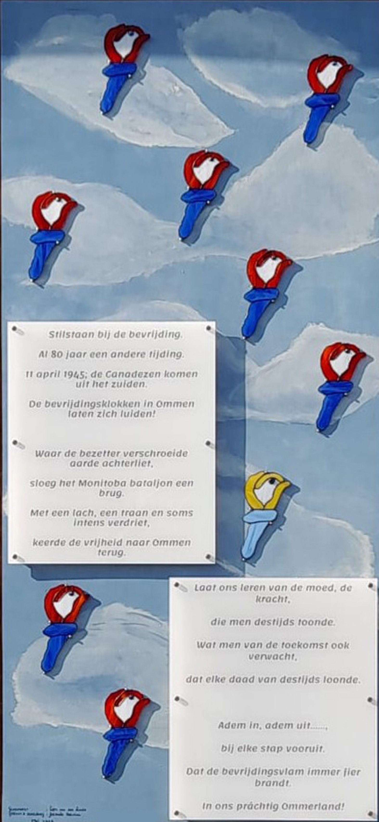 Het bevrijdingspaneel heeft een mooie centrale plek gekregen in Ommen en vertelt over de afgelopen 80 jaar die we in vrijheid konden beleven. De bevrijdingsvlammen, gemaakt door glaskunstenares Loes van der Linde staan symbool voor het vuur dat we met elkaar brandend moeten houden. Het gedicht, geschreven door Jolande Aalvink staat vooral stil bij de Canadezen die Ommen bevrijd hebben en de wens dat dit een blijvende vrede is. Laat ons alert en waakzaam blijven en blijven omzien naar elkaar.