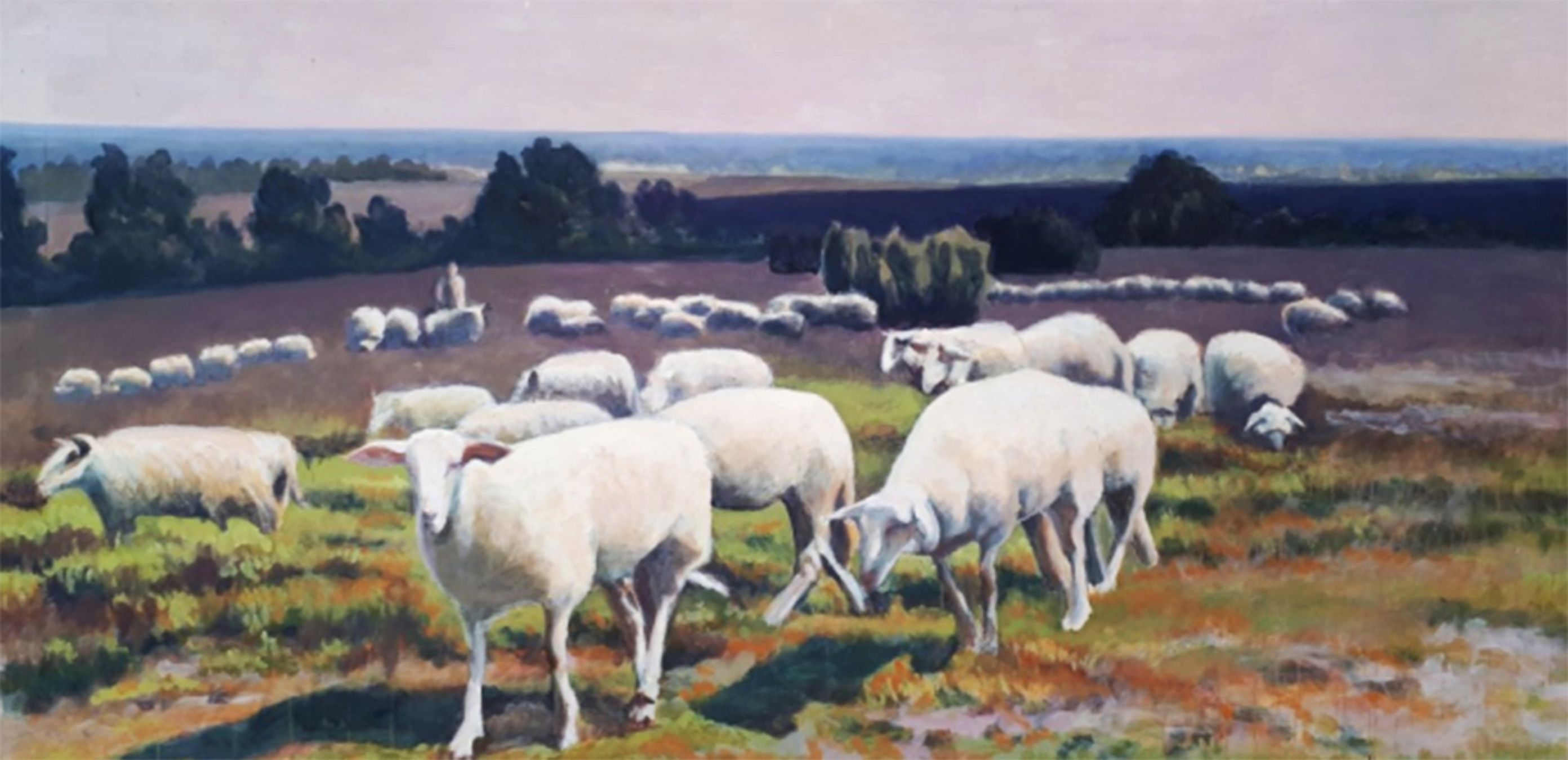 Harry Soepenberg uit Den Ham schildert vooral landschappen waarin hij de sfeer en het licht van het Vechtdal en de Reest weergeeft. Deze streek biedt genoeg inspiratie om een leven lang te kunnen schilderen. Dit paneel is een grote uitvoering van een klein schapenschilderij uit 2016 waarbij de schapen en de kleuren iets anders zijn gerangschikt. Om de werking van het licht op kleur en contrast beter te leren zien, schildert hij ook ter plekke buiten. Ter afwisseling verdiept Harry zich ook in andere onderwerpen zoals portret, studies van mens, dier, gebouwen of stadsgezichten.
