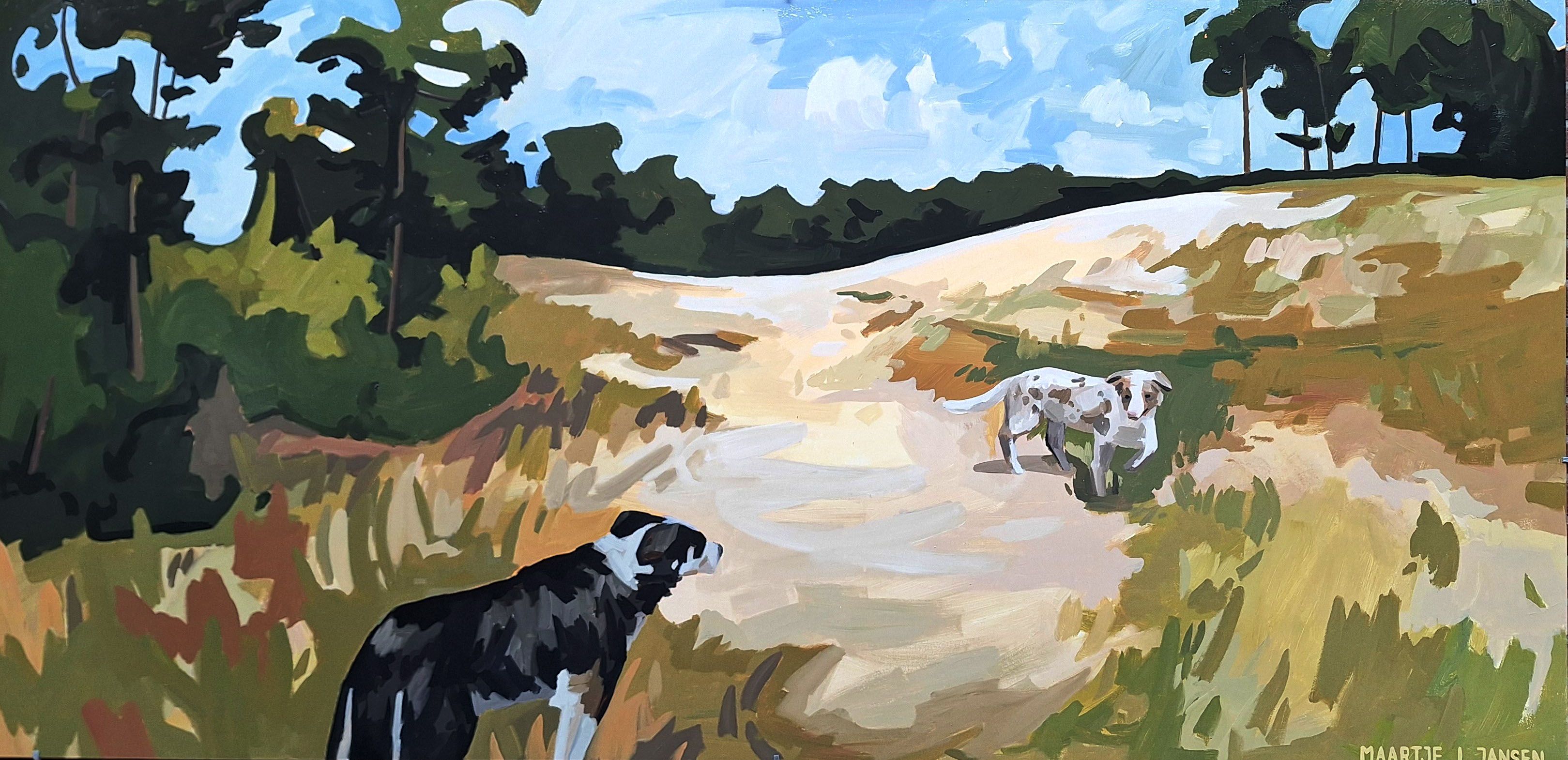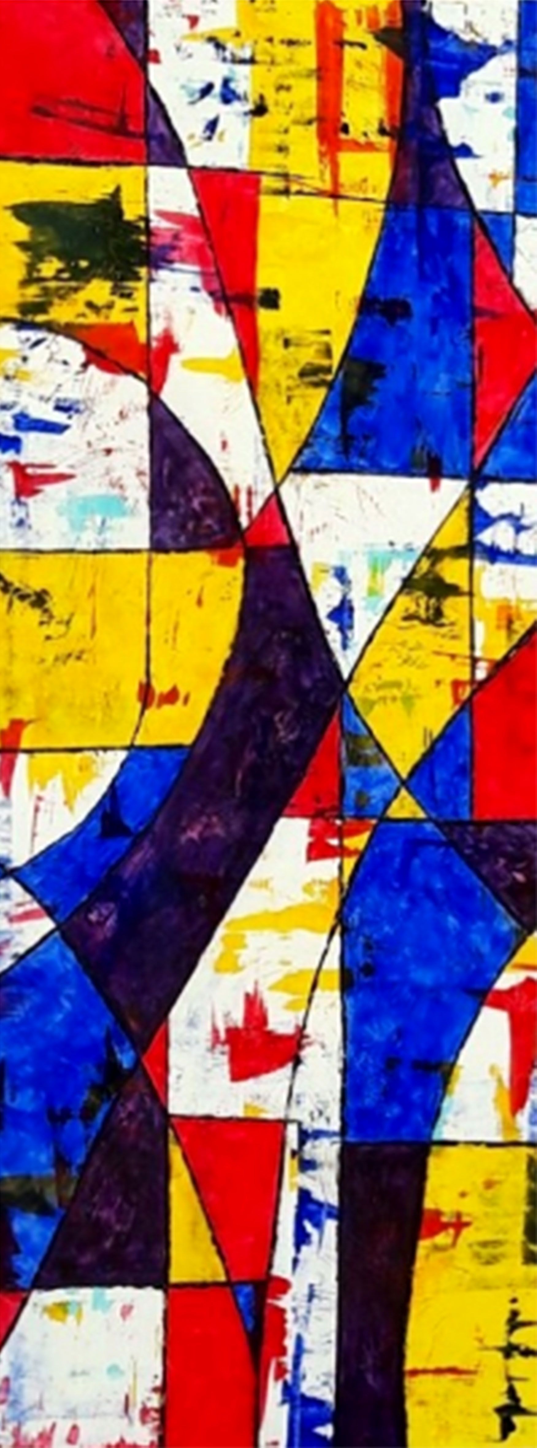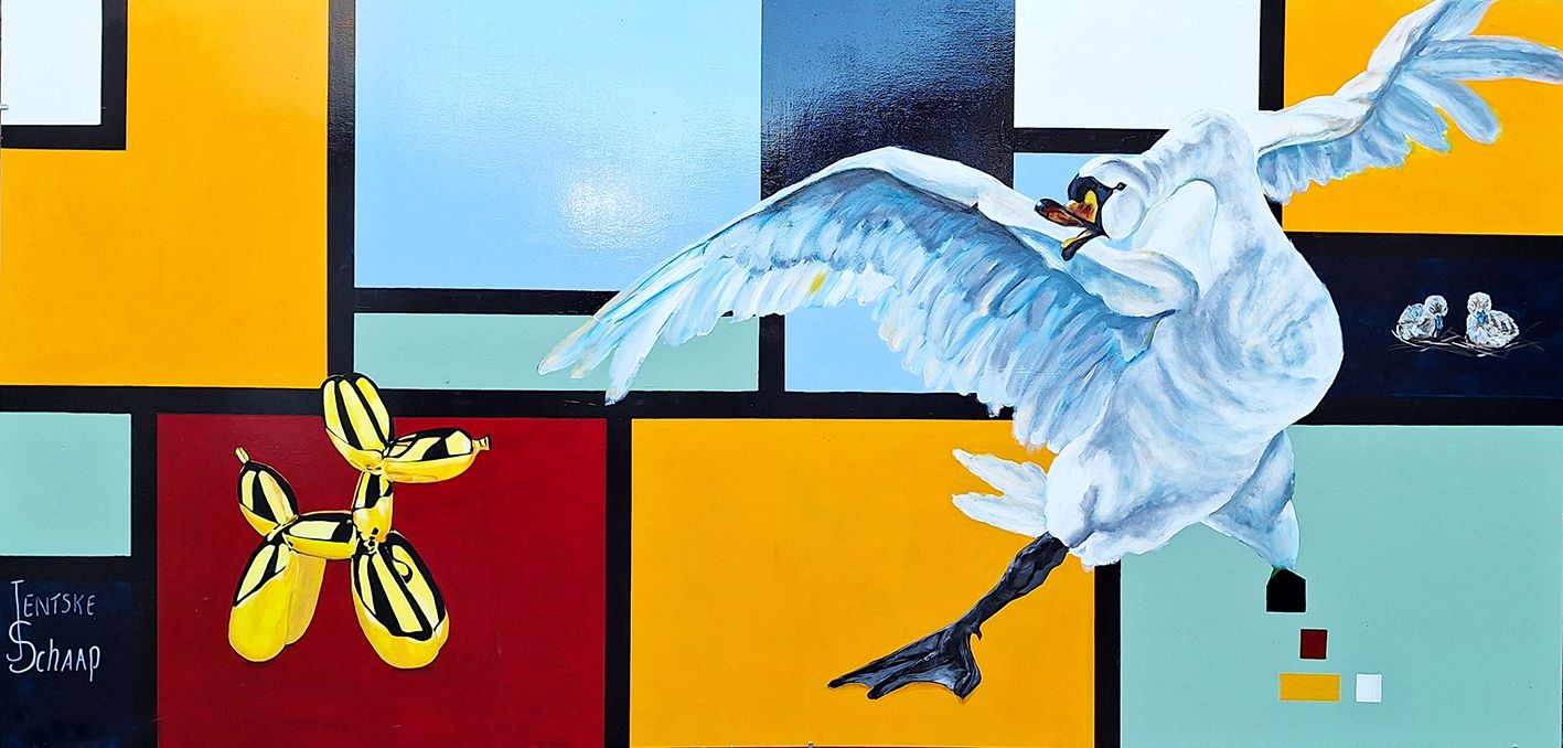 En dat heb ik gevonden in de kunst. Kunst is namelijk als een universele taal; het nodigt uit om te kijken, te voelen, nieuwsgierig te zijn. Voor dit schilderij heb ik inspiratie gehaald uit drie heel verschillende kunstenaars: Piet Mondriaan, met zijn strakke lijnen, Jan Asselijn, die schoonheid en beweging bracht met zijn beroemde zwaan, en Jeff Koons, die met zijn speelse ballonhonden een vleugje lichtheid aan onze tijd heeft toegevoegd.