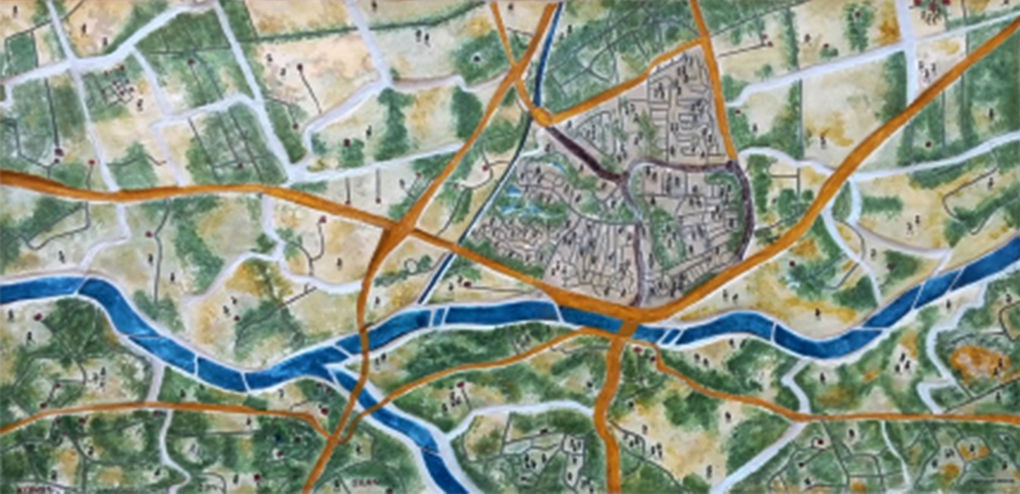 Hier ziet u Ommen met bewoners, bezoekers en de Vecht, vanuit ruimteperspectief gezien. Het is een heel klein stukje van de aarde. De mensen zijn klein, je ziet ze naar Ommen komen, er zijn en weer gaan. Vanuit de ruimte zijn het net een soort kriebeltjes met onderling weinig verschil. De bruisende Vecht, als symbool van het leven, stroomt centraal door Ommen. De mensen zullen allemaal weer eens moeten gaan. De Vecht zal blijven. Zo is het leven. Dit paneel is gemaakt van pa-pierklei.