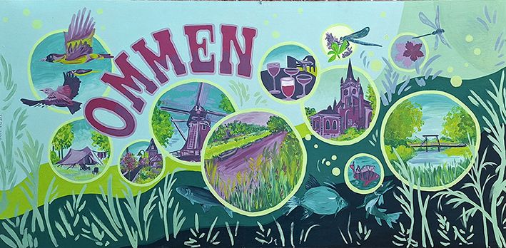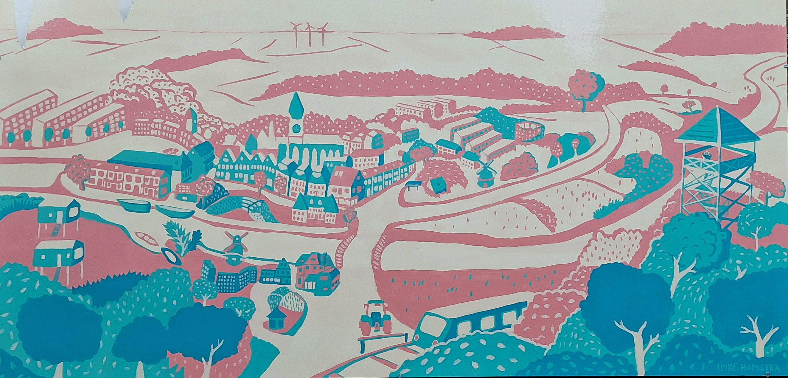 Mijn inspiratie voor dit paneel in Ommen haalde ik uit het gebied eromheen. Er is veel natuur, en er zijn verschillende manieren om ver te kunnen kijken. Zo is er de uitkijktoren maar ook de Lemelerberg. Vanuit dat perspectief wou ik Ommen laten zien. Door te kiezen voor vrolijke kleuren en een minimaal kleurenpalet wou ik de rust van de natuur ook in het schilderij terug laten komen.