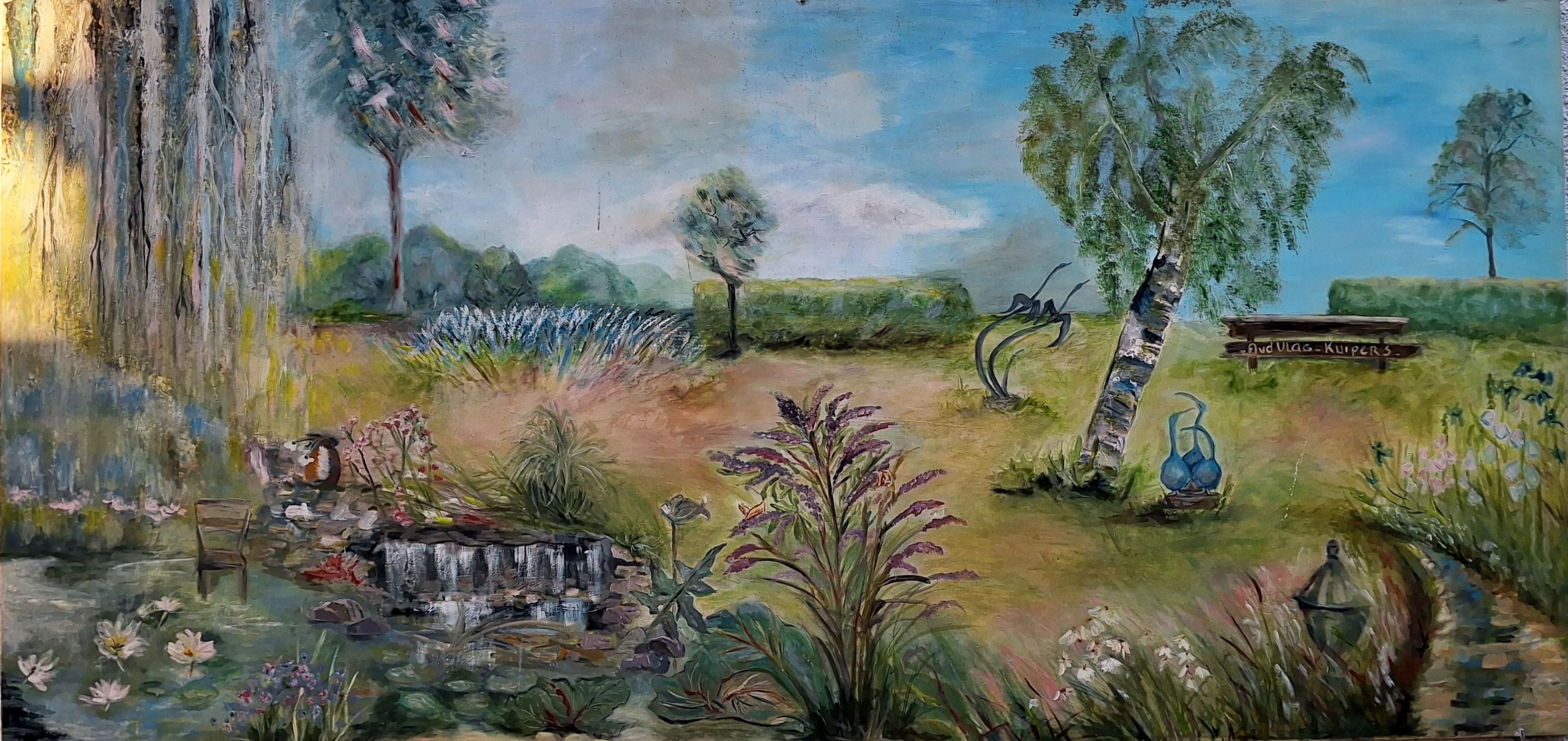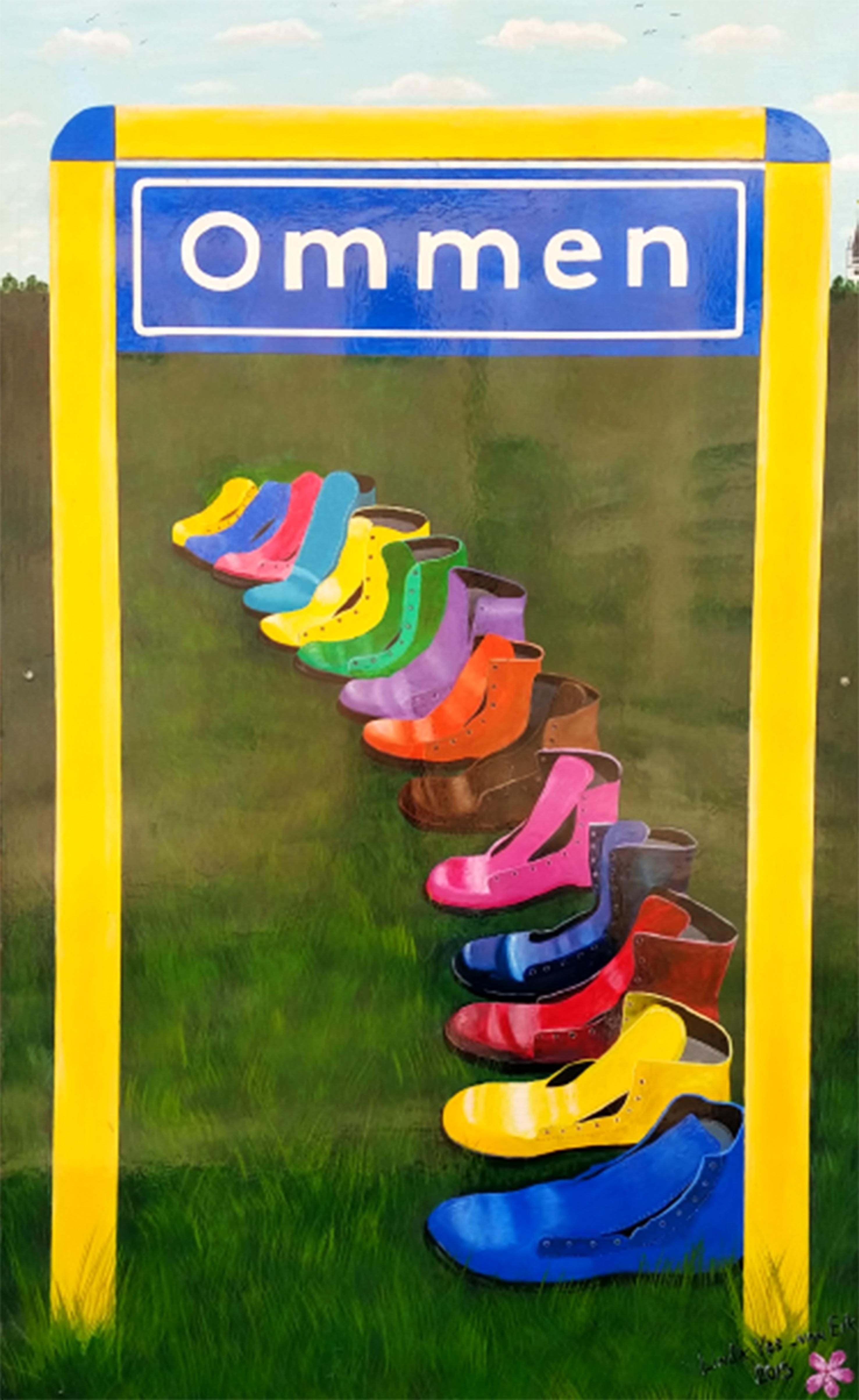 Toen ik, vanwege een zoektocht naar een huis, in Ommen terecht kwam raakte ik al wandelend door deze stad blij verrast door de prachtige panelen die ik zag. Het was hartje winter en bar koud maar de vrolijke kleuren en mooie taferelen warmden mij op. Ik woon nu twee jaar in Ommen en word nog steeds blij van de panelen. Helemaal blij werd ik toen ik er zelf één mocht maken. Ik houd van spelen met kleuren. Reden voor mij om me uit te leven met kleur in het maken van schilderijen. Voor dit paneel koos ik frisse en vrolijke kleuren. Hopelijk wordt u er ook blij van!