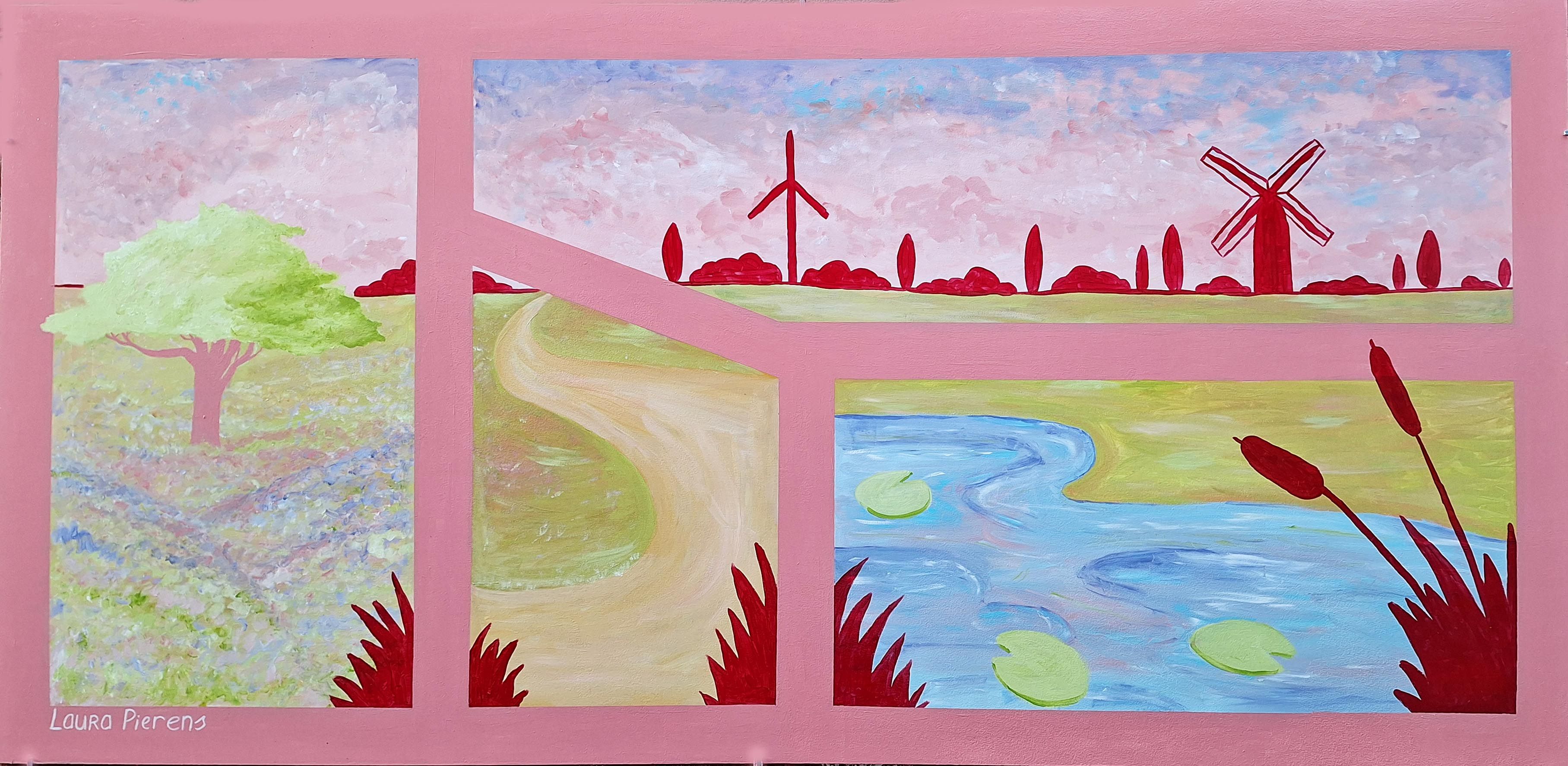 'Uitzicht op de velden' is een kleurrijk kunstwerk geïnspireerd door de natuur in Ommen en omliggende gebieden. Het toont een mozaïek van verschillende vlakken, waarin unieke scènes te zien zijn van de Nederlandse natuur. De heldere kleuren versterken de schoonheid van de flora en fauna. De verscheidenheid aan landschappen roept een gevoel van vreugde en verbondenheid met de omgeving op, alsof men door een roze bril naar de rijkdom van de Nederlandse natuur kijkt.